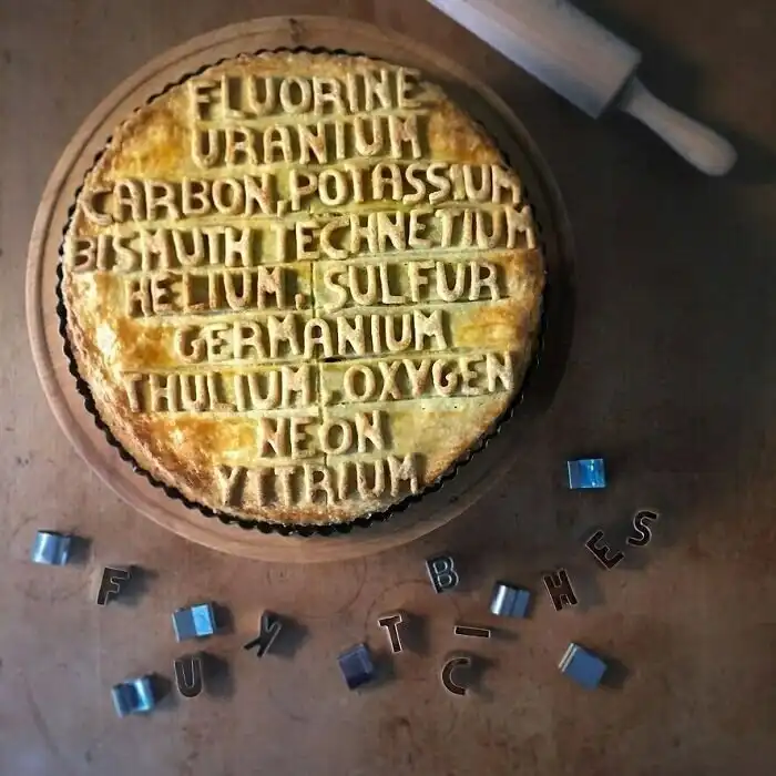 "Пирог FBGM - еще один пирог, вдохновленный Интернетом. Мне нравится противопоставление таблицы Менделеева и хип-хоп культуры: только в Интернете можно найти такие вещи. Если перевести все эти элементы в их символы, получится фраза FUCK BiTchHeS GeT mONeY - (F) фтор (U) уран (C) углерод (K) калий (Bi) висмут (Tc) технеций (He) гелий (S) сера (Ge) германий (Tm) тулий (O) кислород (Ne) неон (Y) иттрий - песня Junior Mafia в исполнении Notorious BIG".