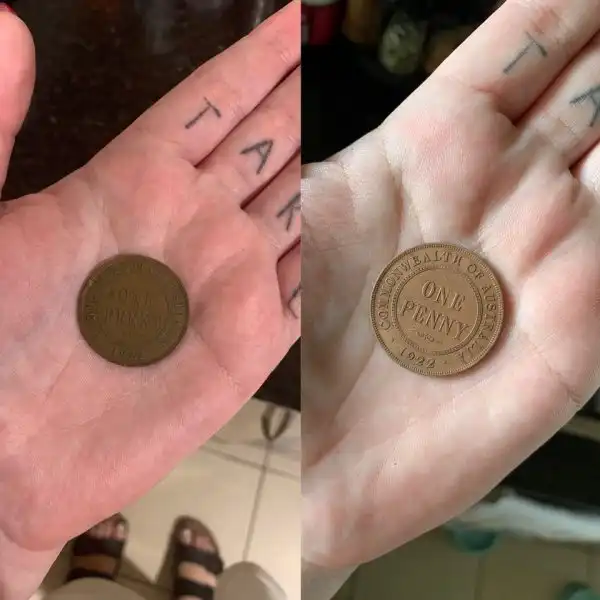Старая монета до и после того, как она провела 8 часов в кока-коле