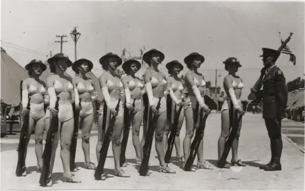 Женское подразделение 30-й пехотной дивизии армии США в купальниках, касках и винтовках M1917 Enfield, 1935 год