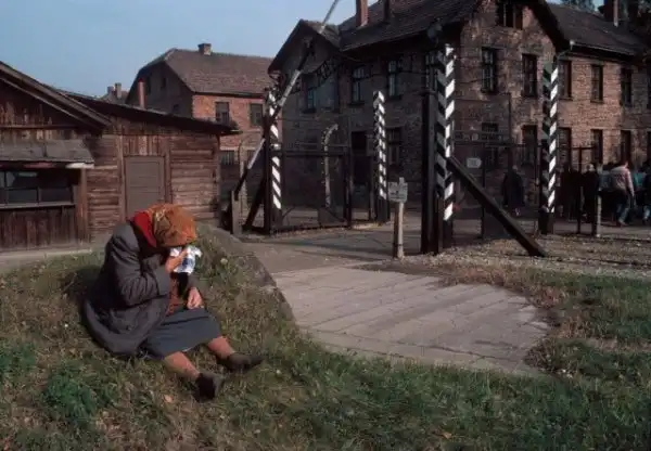 Женщина плачет у ворот музея концлагеря Аушвиц, 1981 год