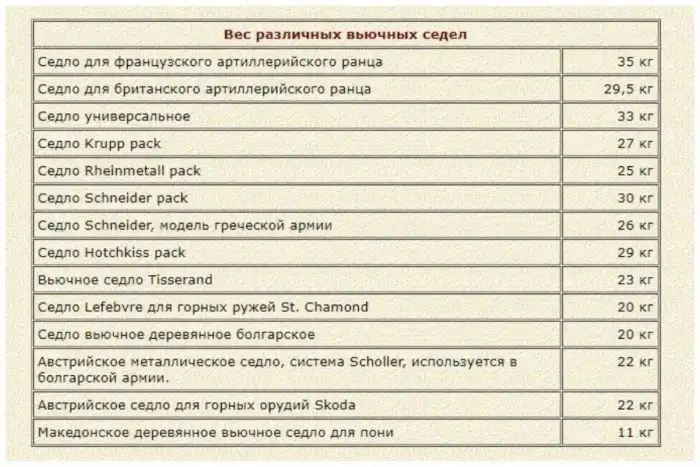 Сначала, в 1880-х гг., вьючные седла болгарской артиллерии были скопированы с швейцарских, так как Швейцария считалась страной с наибольшим опытом ведения горных боевых действий