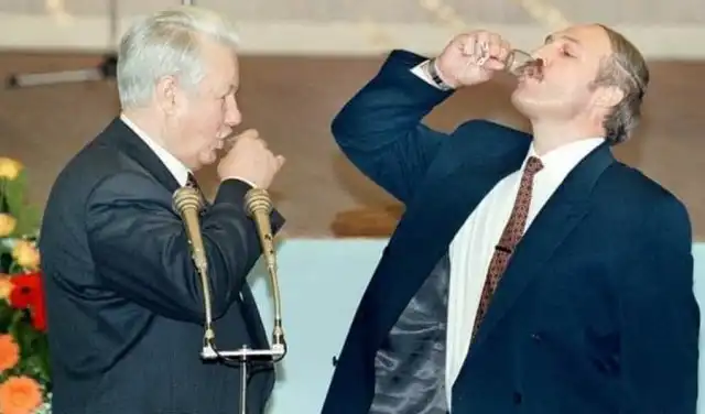 Борис Ельцин и Александр Лукашенко в Кремле после подписания договора о союзе Беларуси и России, апрель 1996 год
