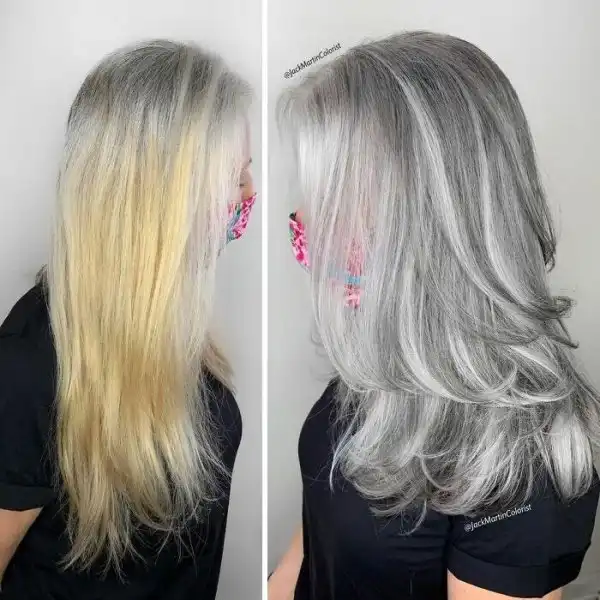 Что он делает: сначала специальным составов удаляет любой оставшийся на волосах искусственный цвет - остатки предыдущего окрашивания. Затем обесцвечивает волосы, сохраняя при этом седые корни, а потом подбирает новый цвет под цвет корней волос и создает красивую седину по всей длине. Смысл в том, чтобы привыкнуть к седине и, когда она станет неизбежной, отказаться от окрашивания в пользу естественности.