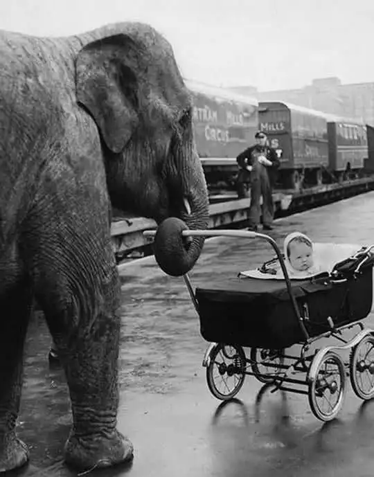 Слон Кама гуляет с дочкой цирковой укротительницы, 1958 год.