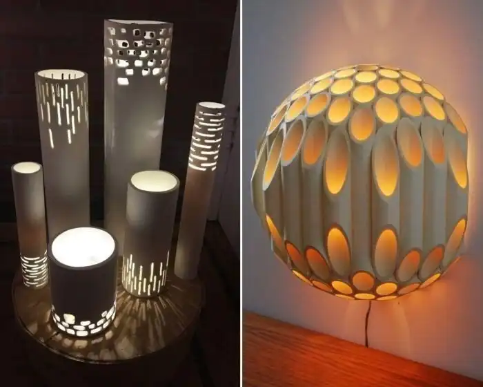 Неизвестно, кому в голову пришла такая оригинальная идея, но из труб ПВХ получаются красивые светильники. На первый взгляд выглядят они просто, но после включения комнату озаряют эффектные световые узоры, рисунок которых зависит только от вашей фантазии. Для большего шика лампу можно декорировать стразами, бусинами и другими украшающими элементами.