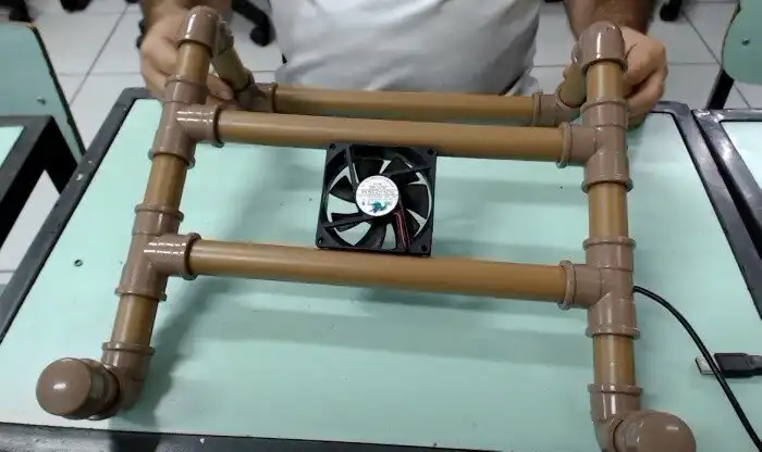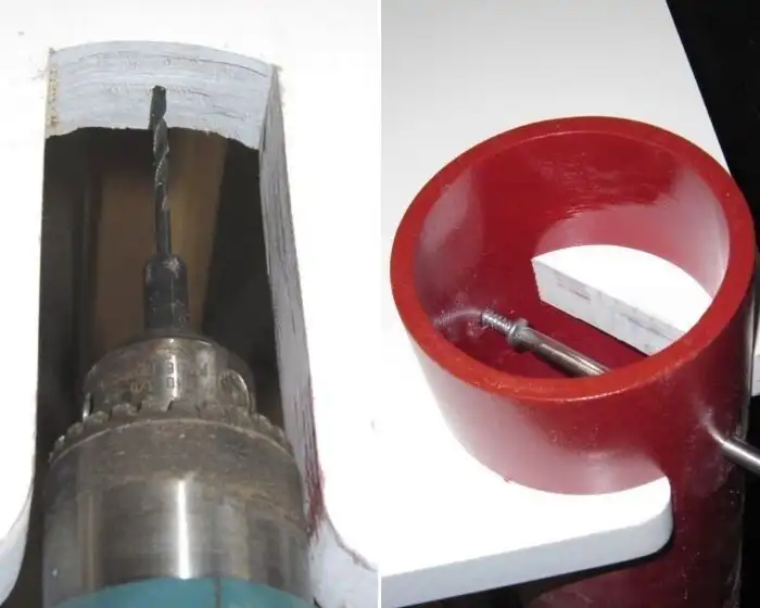 Для сборки стойки кроме труб ПВХ и фитингов также потребуются две пружины и две небольшие деревянные планки. С монтажом придется немного повозиться – элементы конструкции должны быть надежно зафиксированы крепежными элементами. В результате получится легкий сверлильный станок, который всегда найдет применение в хозяйстве.