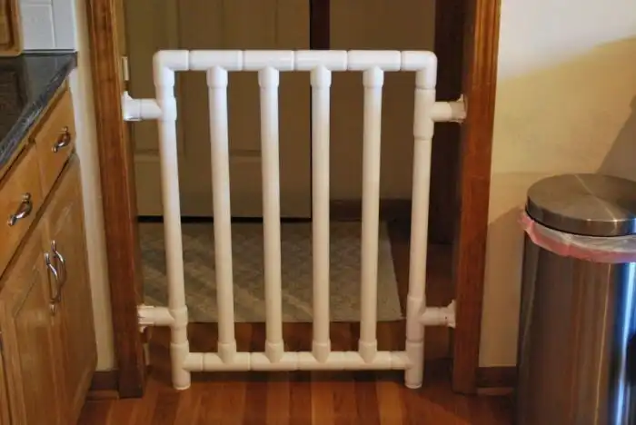 Случается, что двери закрывать нельзя, но в тоже время нужно ограничить выход из комнаты для ребенка или животных. Из ПВХ труб и фитингов легко собирается небольшая решетчатая дверца с короткими отводами по бокам. Далее по обоим сторонам дверного проема устанавливают наполовину срезанные заглушки, с помощью которых дверь фиксируется на месте и также легко снимается.