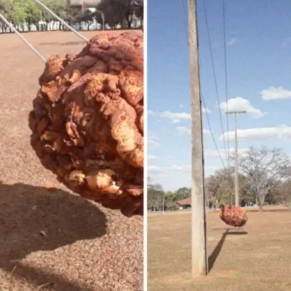 Ответ: "Это арт-объект, расположенный в одном из бразильских университетов. Автор: 59-летняя студентка Марилу Черкейра. Объект сделан пены, пластиковой упаковки, газеты, пенополистирола и камней, а также краски".