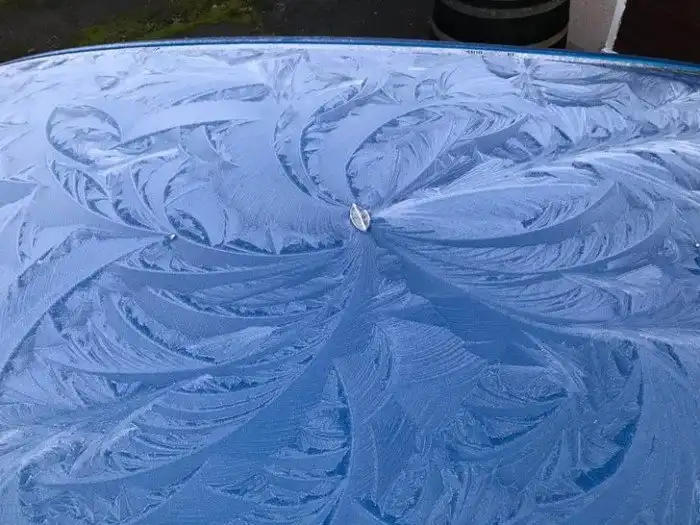 «Сегодня утром на крыше моей машины образовались потрясающие ледяные узоры вокруг листочка»