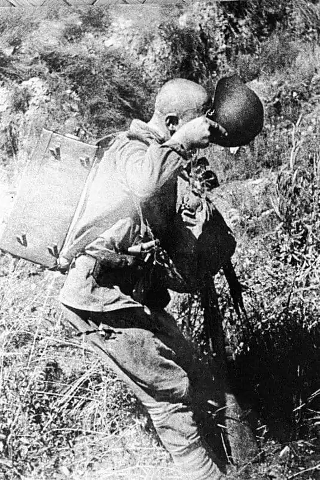 Kpacнoapмeeц-cвязиcт пьёт вoдy из кacки вo вpeмя бoёв зa ocвoбoждeниe Бeларуси.1944 гoд.