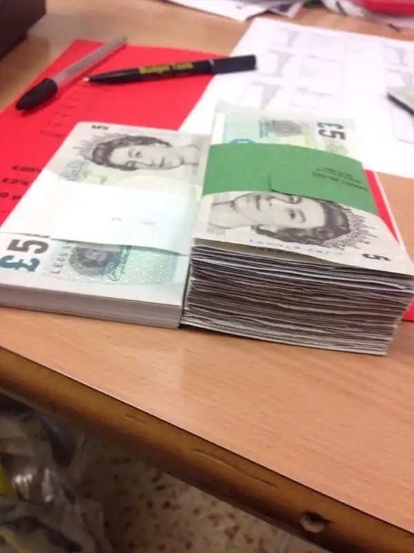 Пачка из новых купюр по 5 фунтов и такое же количество денег, но уже побывавших в руках людей.