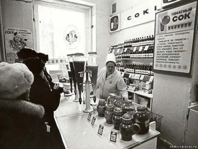 Продажа соков на разлив в отделе «Соки» продуктового магазина. СССР. 1970–е
