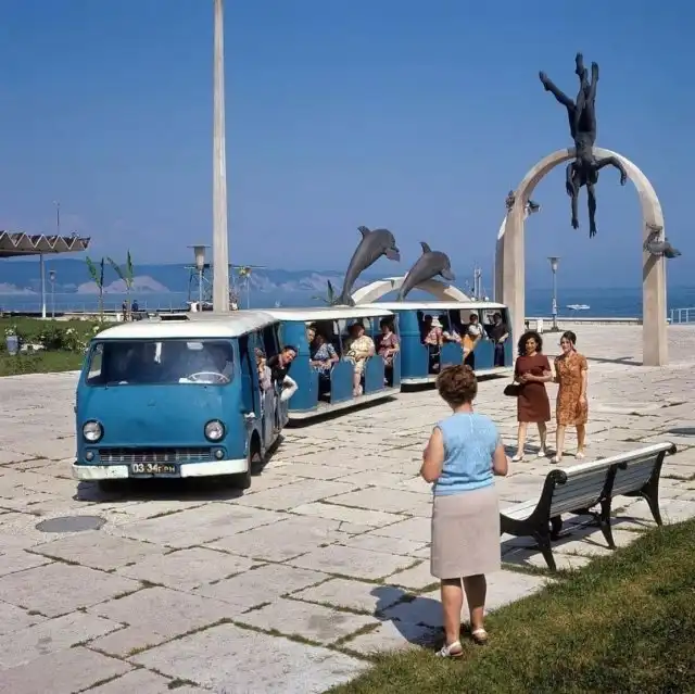 Автопоезд, курсирующий между пляжем и пансионатами. Абхазия. Пицунда. СССР. 1973г.