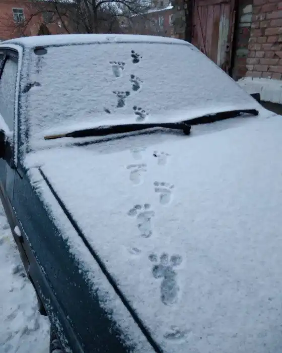 21. Соль с дорог осталась на авто, ее захотели попробовать козы. Следы - это языки животных