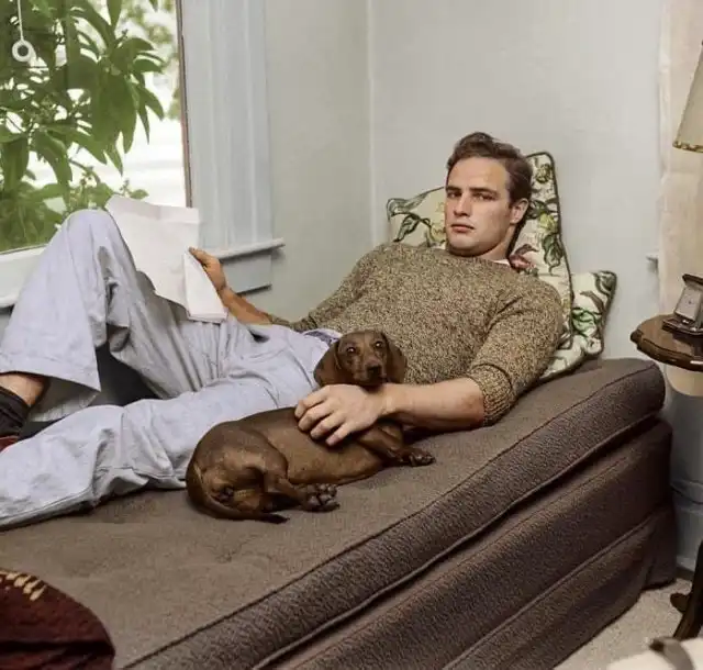 Марлон Брандо и его такса Kurtze Beiner (короткие ножки). Калифорния 1949г.