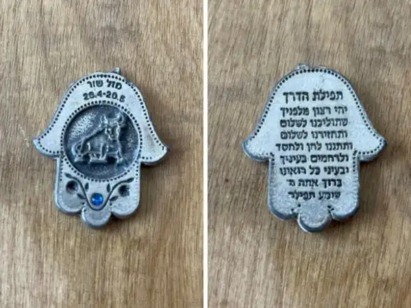 Ответ: Это называется хамса. Бык на нём соответствует месяцу Тельца — שור на иврите. На обороте написана молитва путешественника.