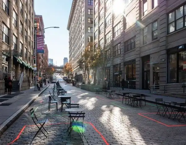 Столики и стулья на пешеходной улице в Нью-Йорке. Здесь можно сесть и перекусить своей едой