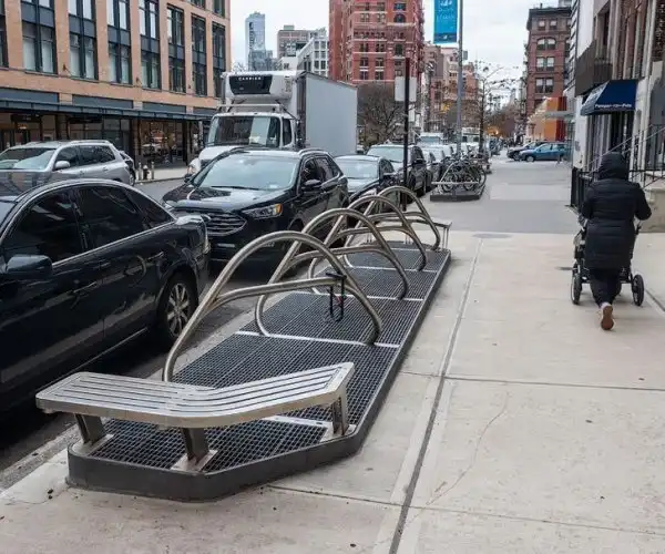 Велопарковка со встроенной скамейкой в Нью-Йорке