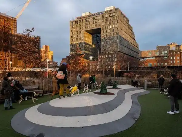 Удобная собачья площадка с поилкой, скамейками и ограждением, Нью-Йорк