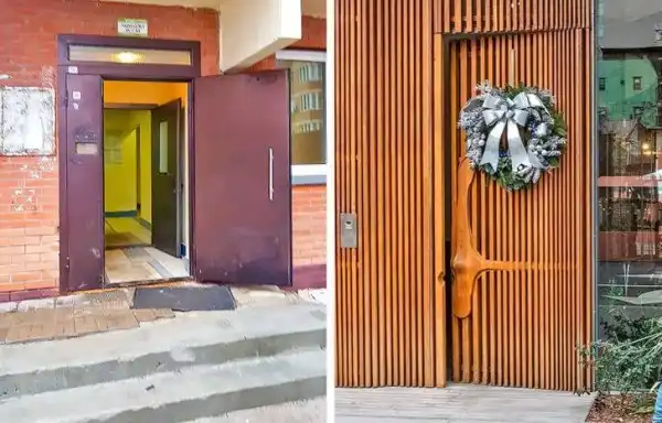Слева — типичный подъезд у нас. Справа — пример того, как подъезды оформляют за границей: простая деревянная дверь сочетается с фасадом дома