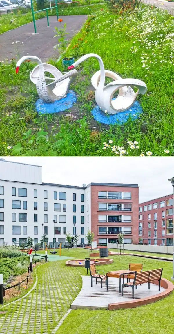Сверху — типичный двор у нас, снизу — обычный двор в Финляндии