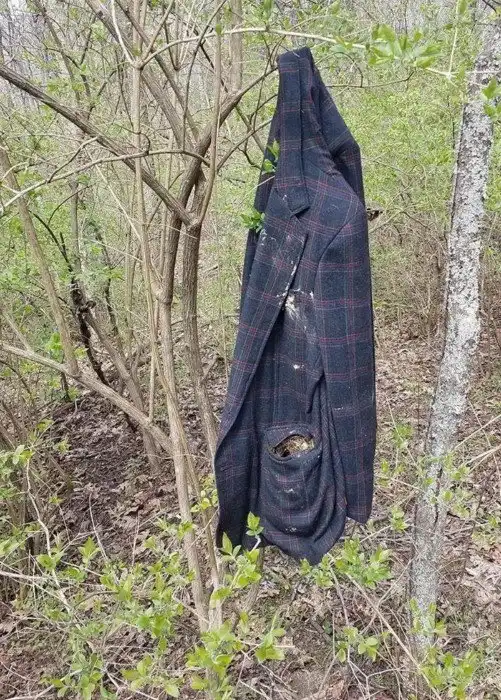 Старый пиджак, висящий в лесу, с птичьим гнездом в кармане