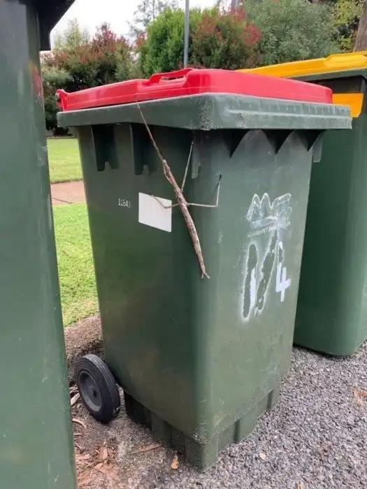 Насекомое-палочник на мусорных ведрах