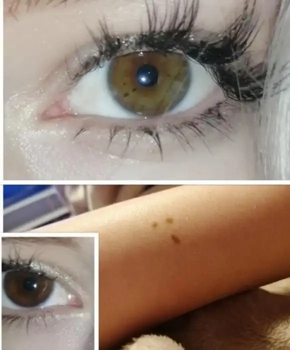У меня одинаковые родинки в форме треугольника на руке и левом глазу