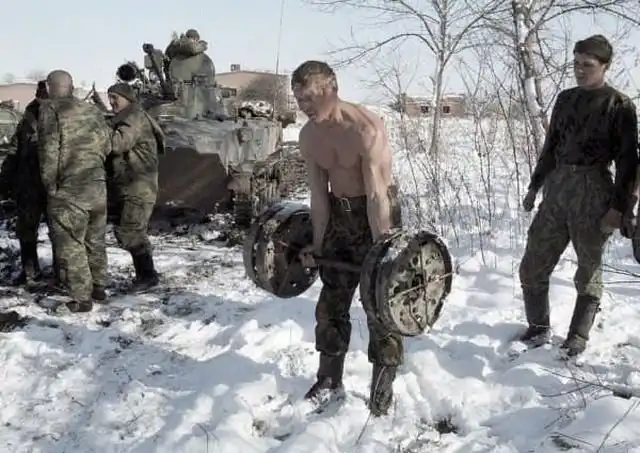 Утренняя зарядка бойцов ВДВ в Чечне, 1999 год.