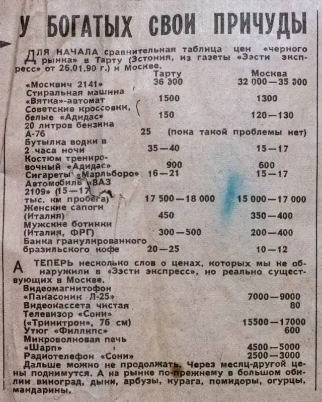 Цены на дефицитные товары, СССР, 6 февраля 1990 года. Средняя зарплата в то время — 250 рублей.