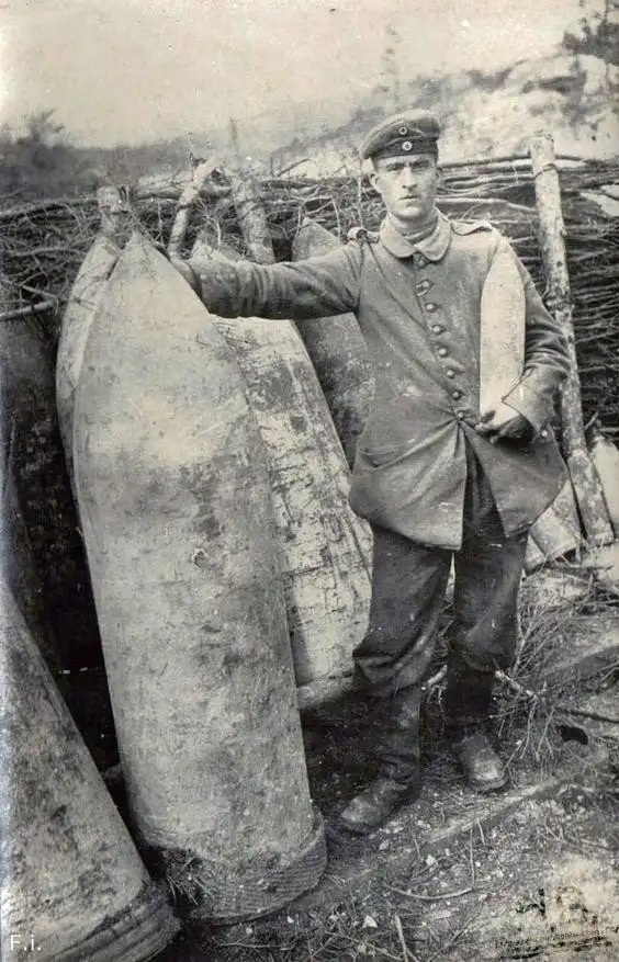 Немецкий артиллерист у 420-мм (16,5 дюйма) снарядов "Большой Берты".