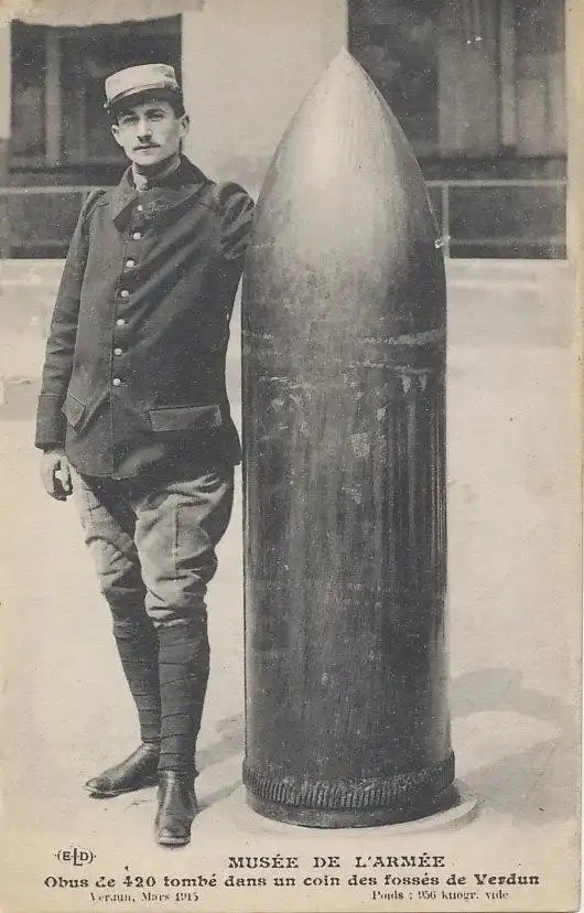 Французский солдат стоит рядом с неразорвавшимся 420-мм снарядом, упавшим на Верден. Март 1916 года. Он весил 2100 фунтов (952 килограмма)