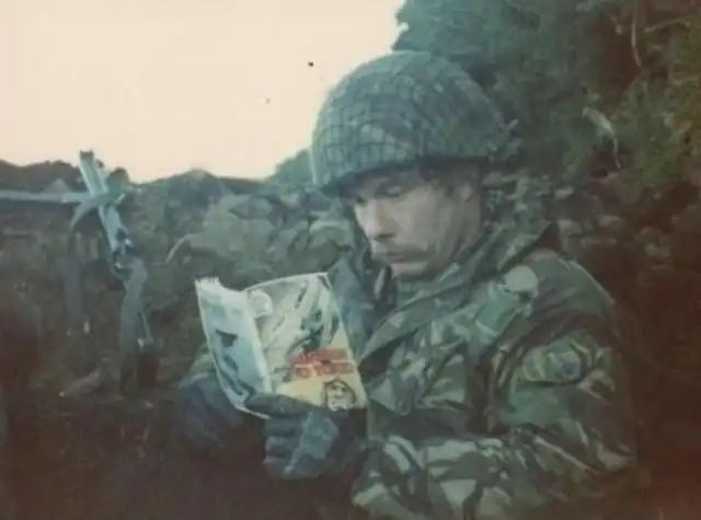 Британский боец Стив Тайер на позиции с пистолетом-пулемётом «Стерлинг», 1982 год. Фолклендские острова.