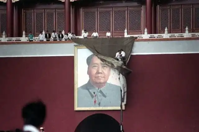 Портрет МАО закрывают от студентов, швыряющих яйца, наполненные краской, площадь Тяньаньмэнь, Пекин, 1989 год.