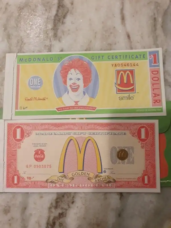 Убирая комнату, нашёл подарочные сертификаты из Макдональдса. Верхний датируется 2001 годом, нижний — 1998-м.
