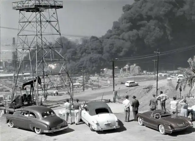 Очевидцы наблюдают за пожаром на нефтеперерабатывающем заводе в городе Сигнал-Хилл, Калифорния, 1958 год.