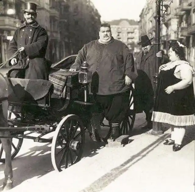 Мужчина (вес 284 кг) со своей женой (вес 174 кг) собирается на прогулку в конной коляске. Германия, 1912 год.