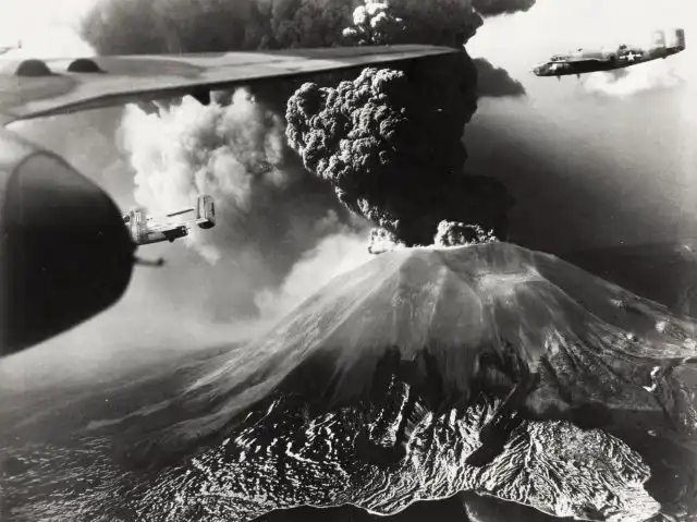 Извержение Везувия в Италии и летящие над ним бомбардировщики B-25, в марте 1944 года.