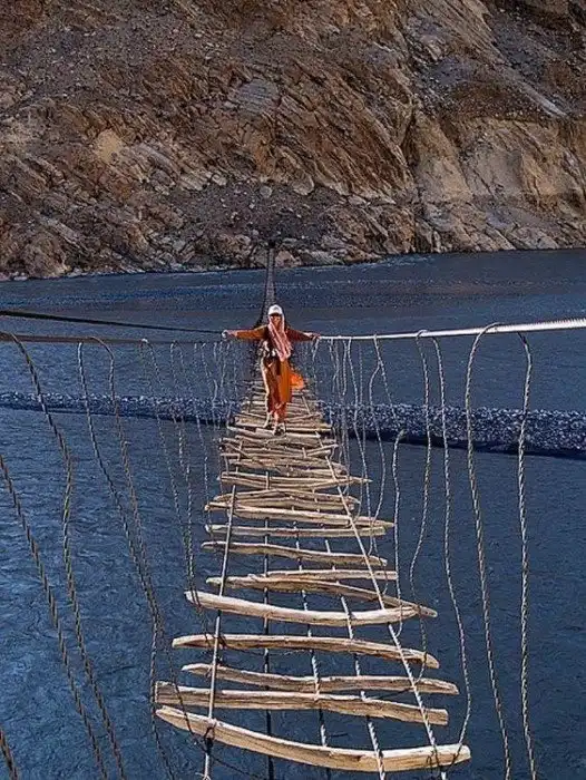 Мост Хуссаини через реку Хунза в горах Каракорум в Пакистане