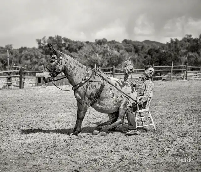 Мул и его хозяин развлекают публику на родео в Квемадо, Нью-Мексико, июнь 1940 года.