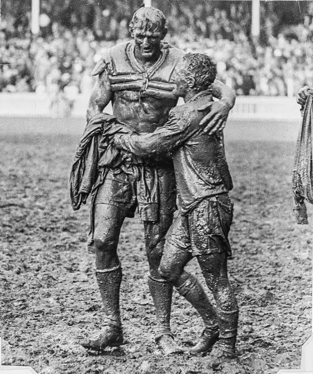 Финал по регби. Капитаны команд-противников Норм Прован и Артур Саммонс обнимаются после матча, 1963 год.