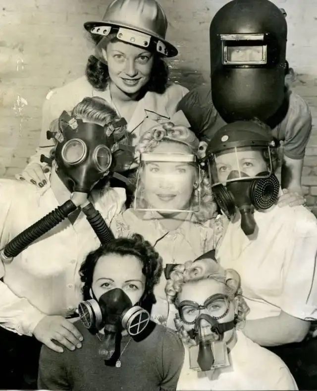 Группа девушек демонстрирует разные типы защитных масок. США, 1940 год.