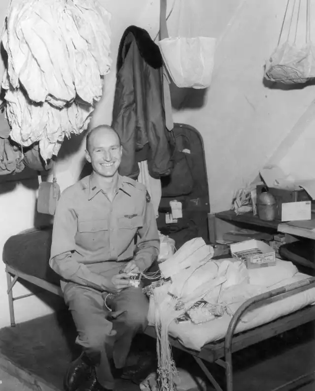 Американский пилот Гейл Хелворсен прикрепляет сладости к маленьким парашютам, которые сбросит для детей Восточного Берлина, находившегося в экономической блокаде. Германия. 1949 г.