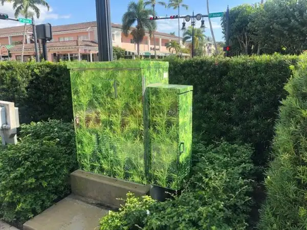 Этот электрический ящик окрашен так, чтобы сливаться с кустами