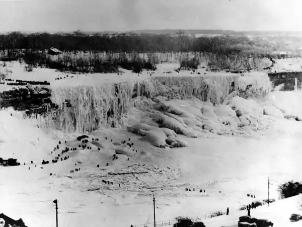 Ниагарский водопад во время заморозков в 1911. Люди ходят прямо у основания ледяного водопада.