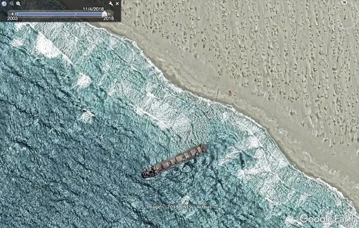 «Я недавно прочитал книгу «Скелеты на Захаре. Правдивая история выживания». В ней рассказывается об американских моряках, потерпевших крушение на северо-западе африканского побережья в 1815 году. Ну что сказать - не повезло им. Я хотел посмотреть, смогу ли я найти следы какого-нибудь кораблекрушения. Я подумал, что на пустынном побережье хорошо сохранились бы металлические обломки. Найти этот брошенный корабль на северо-западе Южной Африки не составило труда. Он выглядит как современный - и, конечно же, в 2003 году его там не было (я проверил самый старый из доступных снимков)».