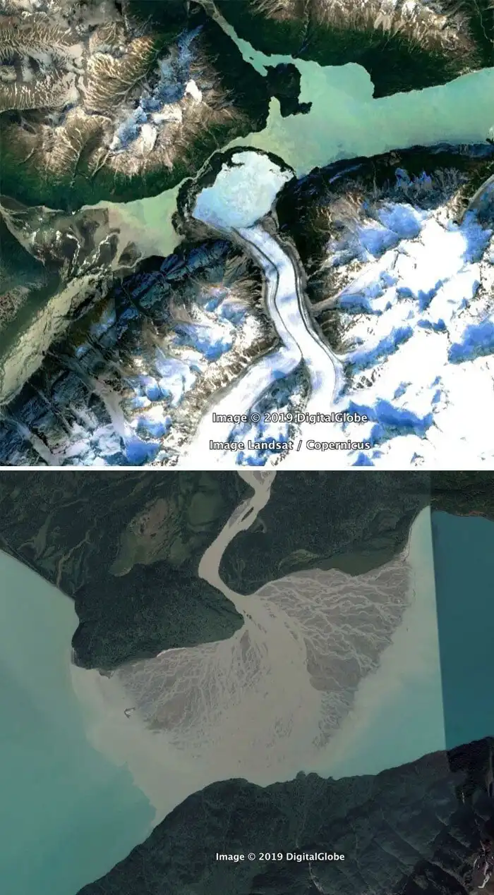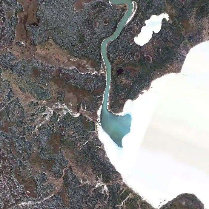 «Ледник, впадающий в озеро. Наличие соединяющего ручья предполагает, что две части озера находятся на разных уровнях. Ледник образовал ледяную плотину. Это довольно круто. Река пытается сделать то же самое в другом озере».