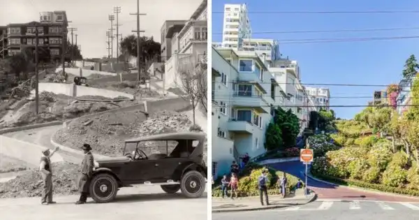 Ломбард-стрит в Сан-Франциско, США, до и после её постройки