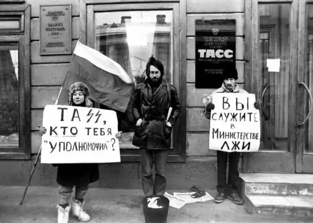 "Вы служите в Министерстве Лжи" - пикет у ленинградского отделения ТАСС, 1991 год.