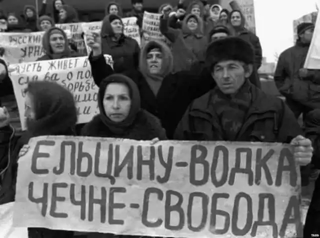 «Ельцину — водка, Чечне — свобода». Митинг накануне выборов президента Чечни. Грозный. Чеченская республика. 13 декабря 1997 г.